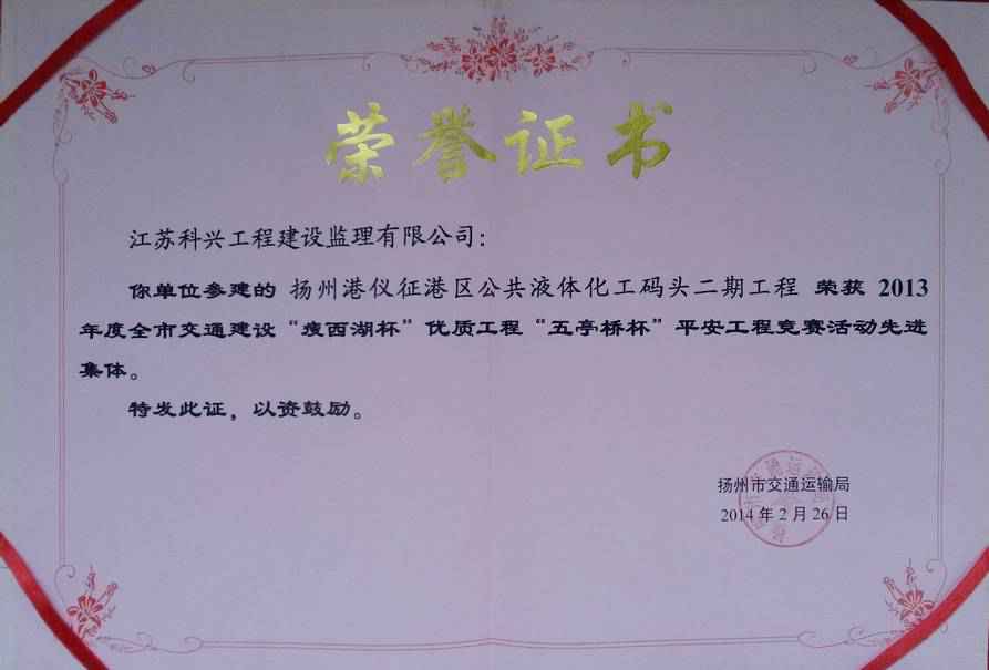 2013年扬州市交通运输局组织开展了全市交通建设“瘦西湖杯”优质工程、“五亭桥杯”平安工程竞赛活动,公司承监的扬州港仪征港区公共液体化工码头二期工程通过积极准备,在检查中项目质量、安全工作得到各级领导一致认可,监理组被评为“瘦西湖杯”优质工程、“五亭桥杯”平安工程先进集体,项目总监代表获得先进个人。 本码头工程为50000DWT油品化工品泊位2个以及相应的配套设施。监理组自2012年6月进场以来一直始终秉承公司“科学严谨、公正独立、规范高效、持续改进”的监理质量方针,严格监理程序,建立和完善监理组织机构及工程质量保证体系、安全保证体系,及时、仔细、认真严格审查施工单位申报的开工报告、施工组织设计、施工技术方案及各类申报表,在市交通质检站历次检查中得到肯定和表扬。现项目已经完工并通过交工验收,工程质量合格。(仪征码头 史其峰) |