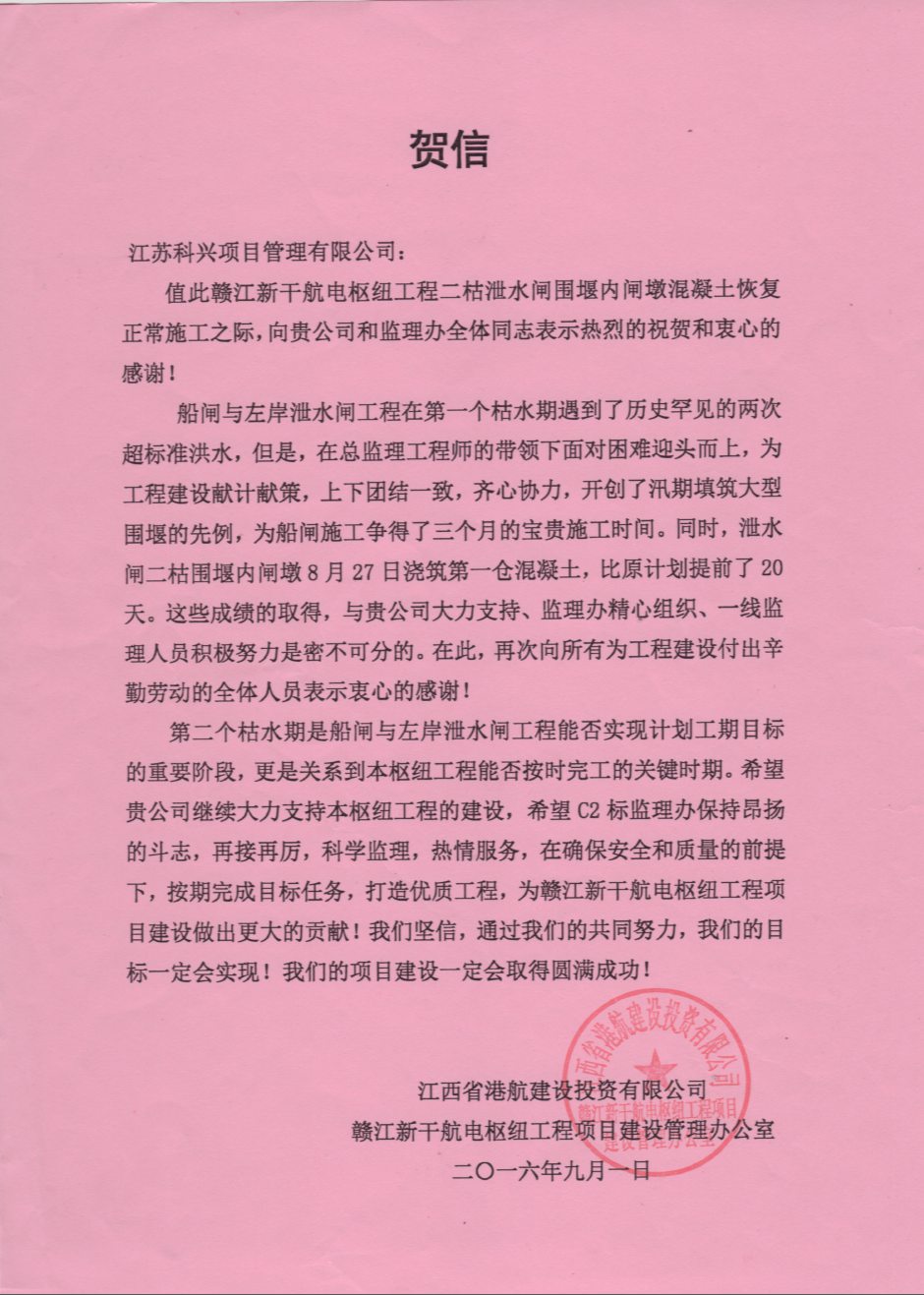 江西赣江新干航电枢纽工程监理办受到业主嘉奖