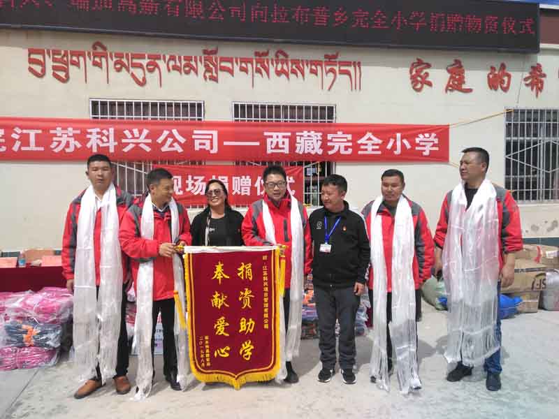 2019年8月30日,开云中国官网入口总经理、瑞迪高新有限公司董事长徐志峰一行带着100余册小学生读物、千余件御寒衣物、江苏开云(中国)为孩子们准备的268个新书包、数万元现金以及所有员工满满的心意,前往西藏自治区南木林县拉布普乡完全小学,进行现场捐赠公益。南木林县教育局副局长巴桑普赤,拉布普乡党委书记桑杰,完全小学副校长珠加一同出席了此次活动,并向公司赠送锦旗表示感谢。