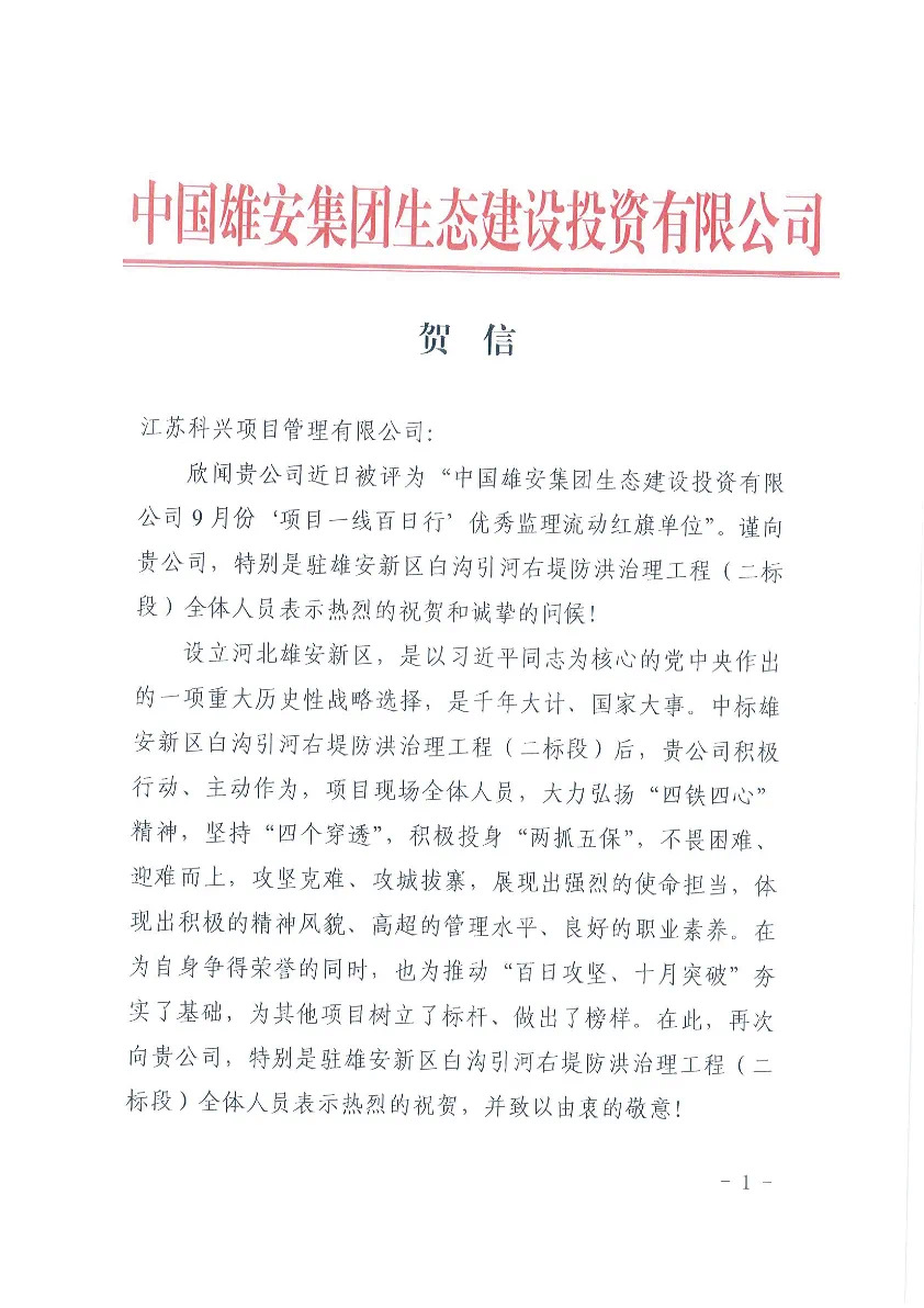 2020年10月21日,由开云中国官网入口承监的雄安新区白沟引河右堤防洪治理工程二标段喜获中国雄安集团生态建设投资有限公司9月份“‘项目一线百日行’优秀监理流动红旗单位”荣誉表彰。