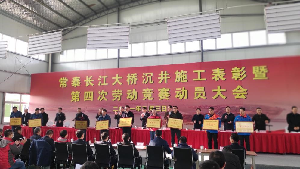 2021年2月3日,立春,常泰长江大桥沉井施工表彰暨第四次劳动竞赛动员大会在泰兴胜利召开。会上,江苏省交通工程建设局、江苏海事局对一年多来在常泰长江大桥主塔沉井基础建设过程中作出突出贡献和取得优异成绩的单位、集体和个人进行了联合表彰,常泰桥指对第四次劳动竞赛作了动员。省交建局局长蒋振雄、江苏海事局副局长徐伟、中国工程院院士秦顺全等领导、专家出席会议。