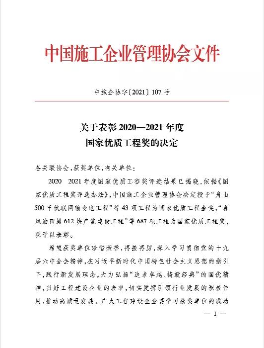据悉,国家优质工程奖是由国家工程建设质量奖审定委员会组织审定,冠以“国家优质工程金质奖”、“国家优质工程银质奖”名义的奖项,是工程建设质量方面的最高荣誉。