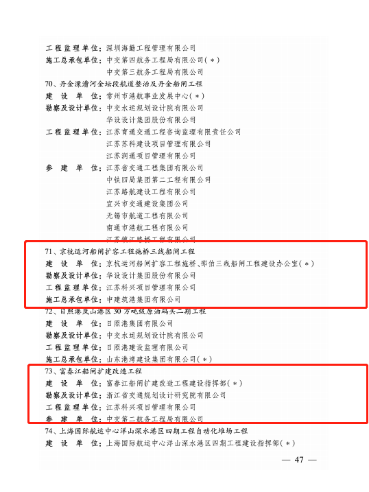 2021126日,2020-2021年度国家优质工程奖评选结果揭晓,公司参建的长江南京以下12.5米深水航道二期工程、恒逸(文莱)PMB石油化工项目荣获国家优质工程奖金奖,京杭运河船闸扩容工程施桥三线船闸工程、富春江船闸扩建改造工程荣获国家优质工程奖!
