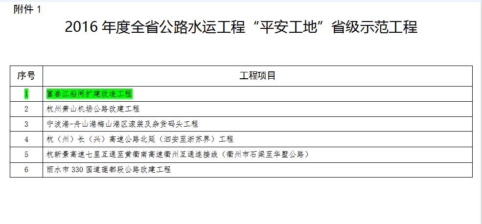 富春江船闸扩建改造工程荣获浙江省公路水运工程“平安工地”省级示范工程 | |