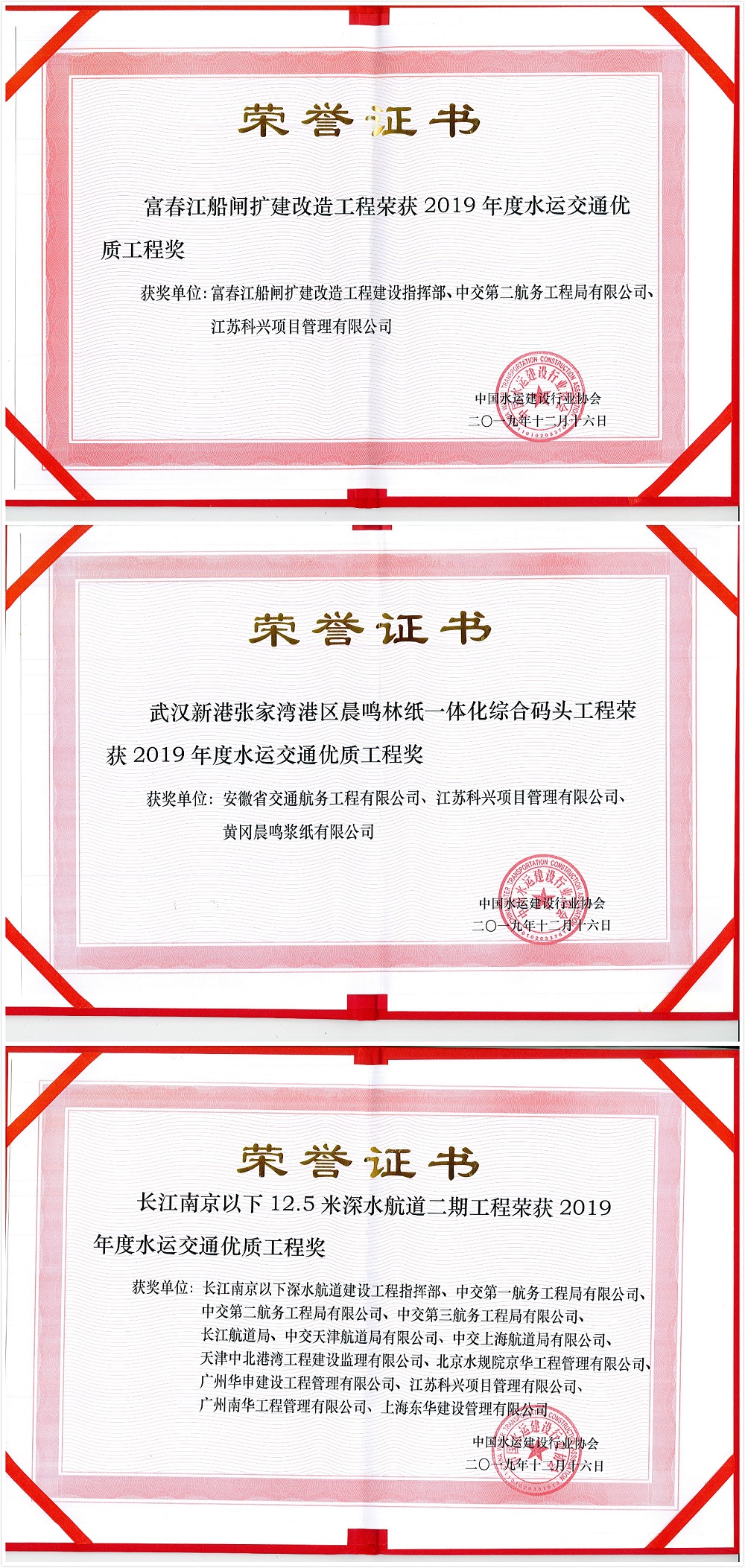 近日,由开云中国官网入口承监的富春江船闸扩建改造工程、武汉新港张家湾港区晨鸣林纸一体化综合码头工程、长江南京以下12.5米深水航道二期工程荣获2019年度水运交通优质工程奖。