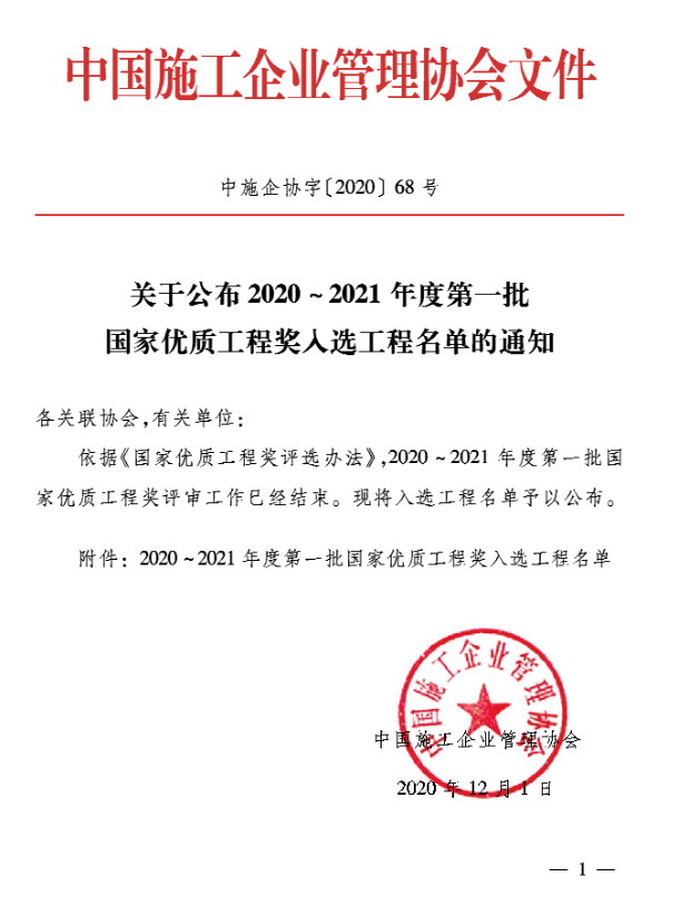 2020年12月1日,由开云中国官网入口承监的浙江富春江船闸扩建改造工程喜获2020-2021年度第一批国家优质工程奖。