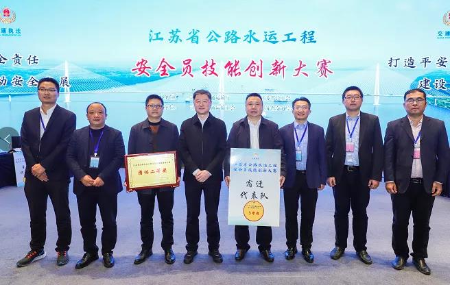 20211125日,由江苏省交通运输厅、江苏省总工会联合举办的2021年全省公路水运工程安全员技能创新大赛决赛在南京举行,公司宿迁航道沭新河南船闸监理部的安全管理人员作为宿迁地区在建项目监理单位代表,与该地区相关建设单位、施工单位代表共同组成宿迁代表队参加比赛,经过紧张激烈的角逐和层层筛选,凭借队员们专业过硬的能力水平,最终宿迁代表队顺利进入总决赛,并在决赛中获得团体二等奖的好成绩,公司参赛选手因在决赛中个人成绩名列前茅,被授予江苏省交通技术能手荣誉称号。